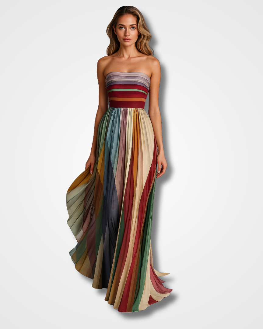 This stunning long dress features a strapless, fitted bodice with horizontal stripe detailing that enhances the neckline and shape. The pleated skirt flows beautifully, showcasing soft diagonal stripes that move gracefully with every step. Designed to flatter and impress, this dress combines artistic design with timeless elegance, perfect for evening events or special celebrations.